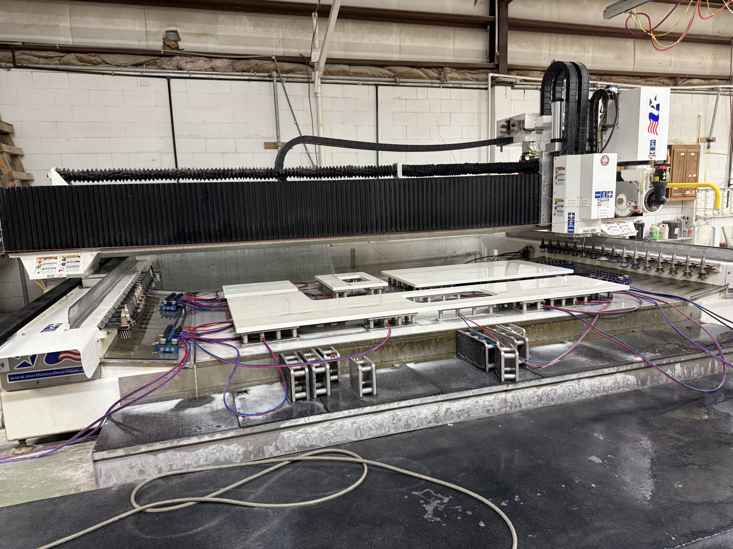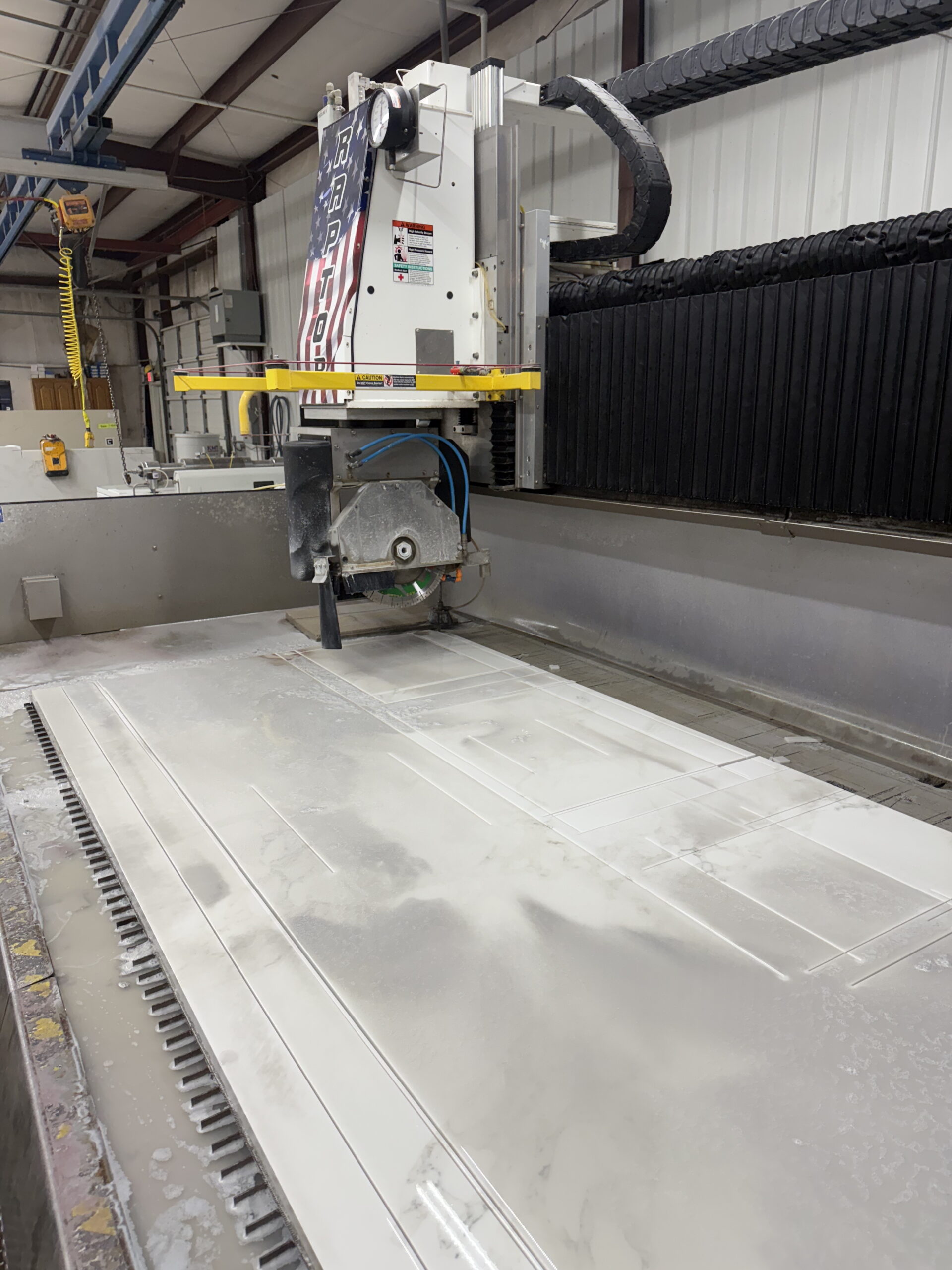 The Raptor took the full slab and used both the saw and the waterjet to break it down cleanly, optimizing yield and material flow.